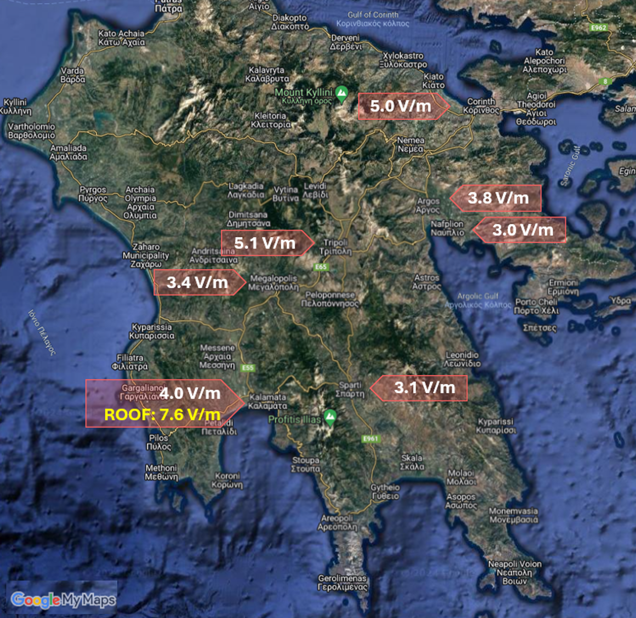 - Spatial Analysis: Short-term ground-level measurements were performed at 77 sites across seven major cities in the Peloponnese Region. These measurements utilized an isotropic triaxial antenna to ensure accurate assessment in non-homogeneous environments.
